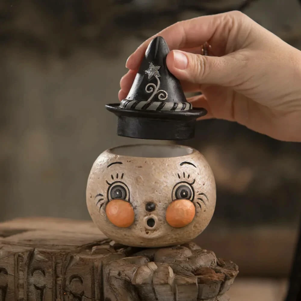 This little Wanda Luna container by Johanna Parker will steal your heart with her charming face. Her hat comes off to reveal a container for little treats.Â