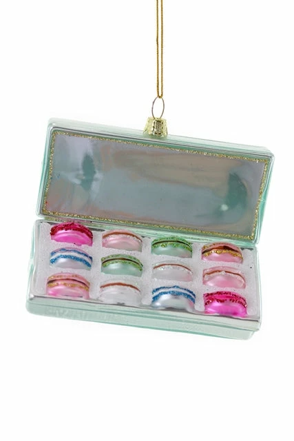 Blue Box of Macarons Ornament, Hand-painted Glass, Glitter detailing, 4″