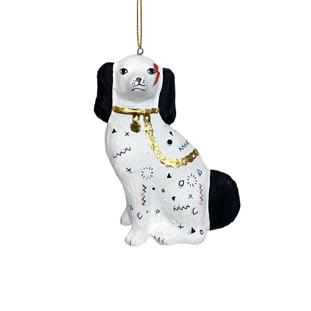Bow Wow Bowie Staffordshire Dog Ornament, papermache, 4.25″