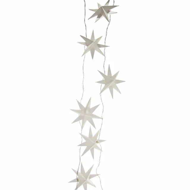 Add a little light to your holiday decor with these illuminated paper star lights. Intricately folded paper stars cover 6′ of soft lights for a festive and fun addition to your holiday decor. Batteries required.