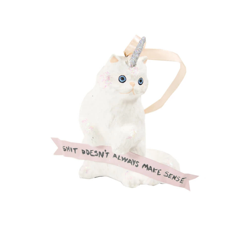 Magical Fantastical Unicorn Kitten Ornament. This sweet papermache kitty has been hand-painted, glittered and adorned with a thick paper board banner reading, “SHIT DOESN’T ALWAYS MAKE SENSE”. She’s as cute as can be and topped with a shiny pink ribbon for hanging. Approximately 3.75″