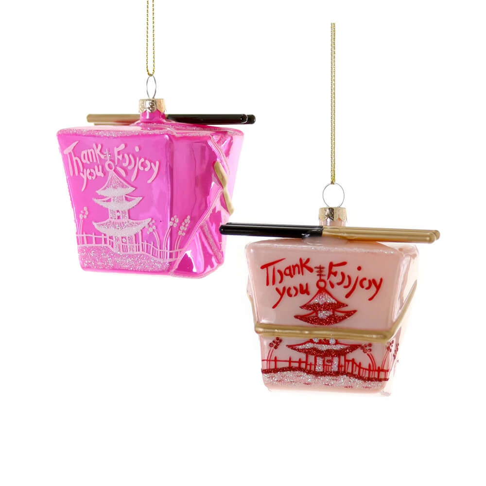 Pink Chinese Take Out Box Ornament, Hand-painted blown glass with glitter detailing, Available in two assorted colors: magenta and light pink. 3.75″