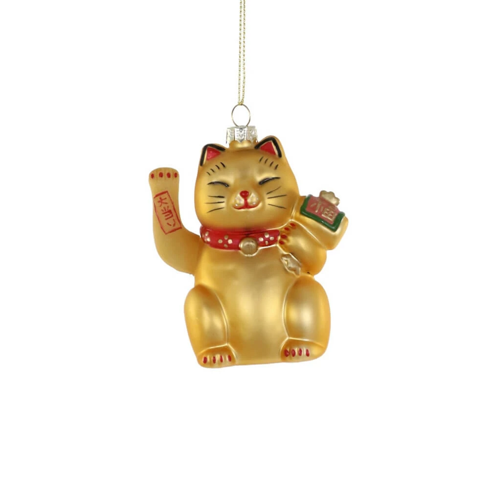 Beckoning Gold Lucky Cat Ornament, Glass, 4.25″