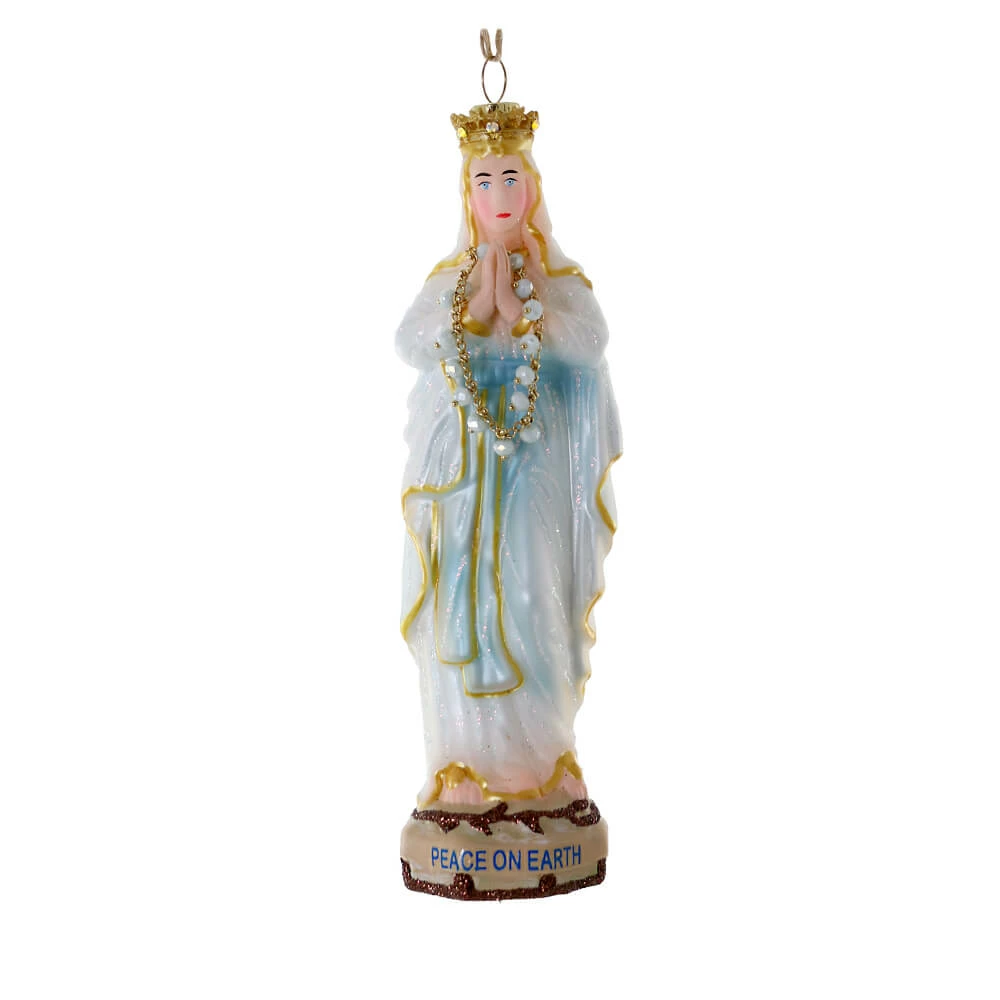Crowned Mary Ornament, Blown glass with glitter detailing, 7″