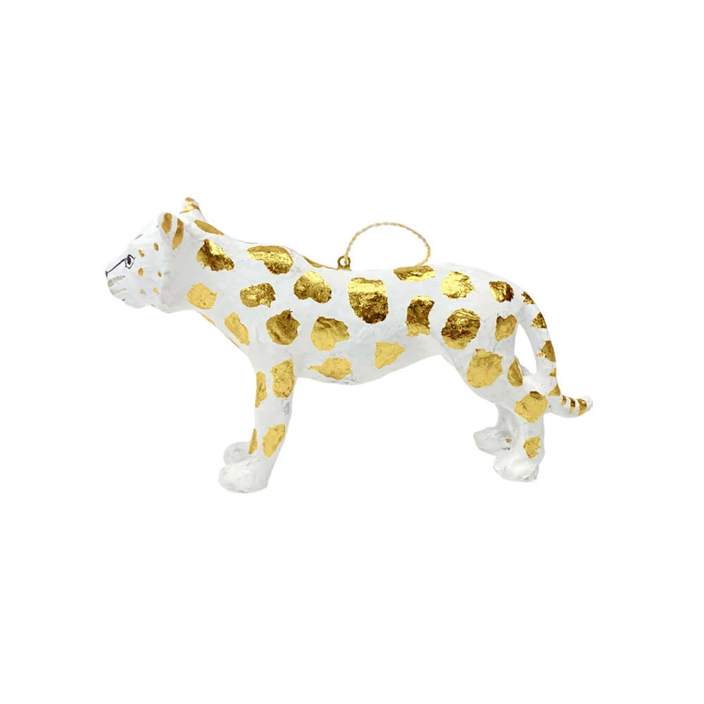 Gold Spotted Cheetah Ornament. Hand-painted papermache with golf-leafed spots. 4.25″