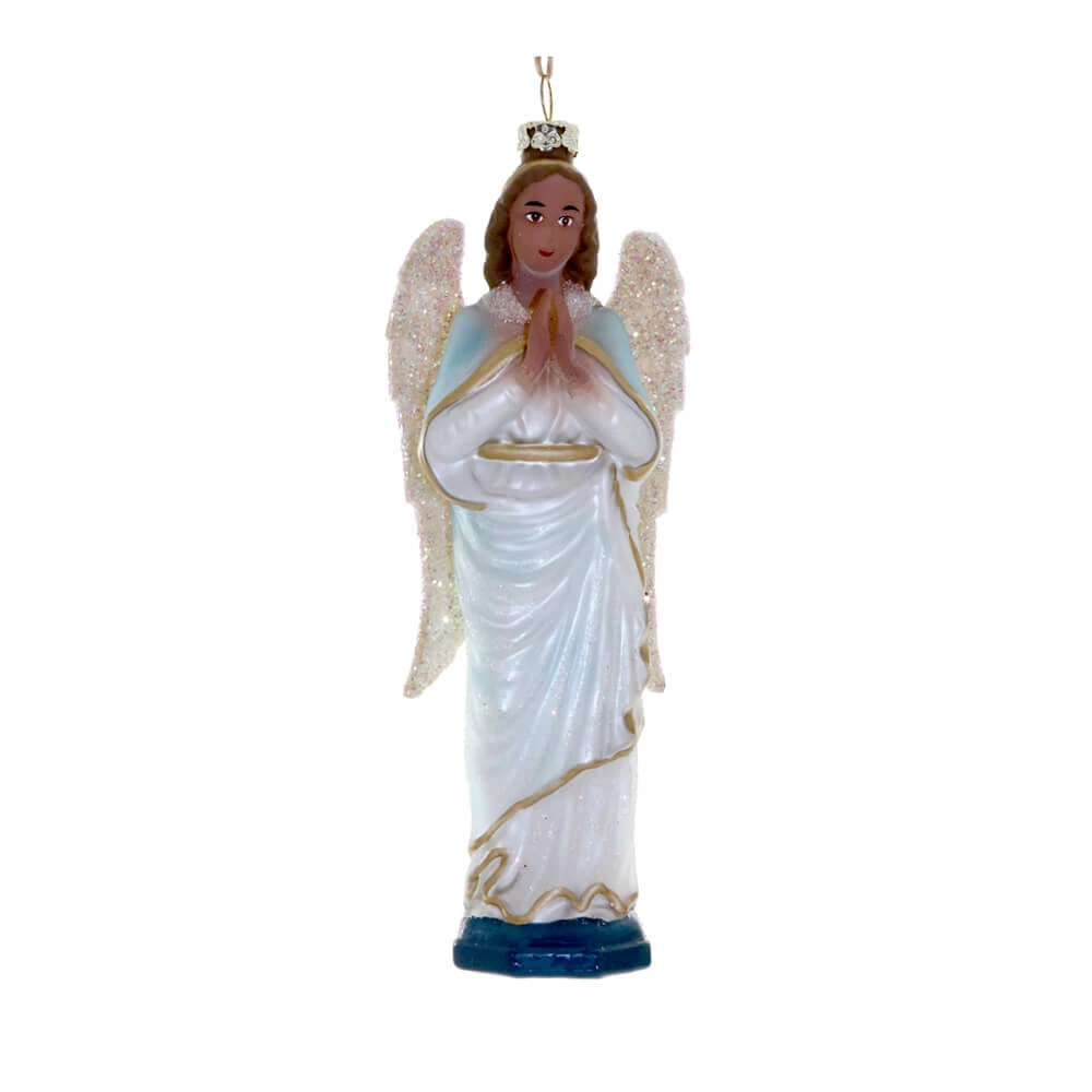 Heirloom Angel Ornament, Blown glass with glitter detailing, 7.25″