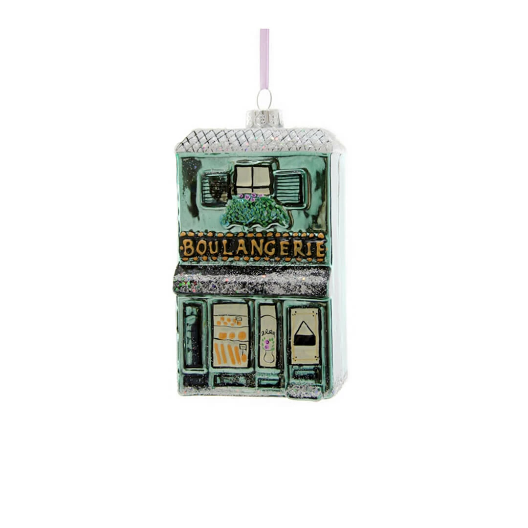 May this shiny Boulangerie Shop Ornament transport you back to a picturesque French Village or the cobbled streets of Paris. Mmm…we can almost smell the scent of freshly baked bread! This adorable mint Bakery Shop has been beautifully hand-painted and glittered and features a lovely velvet ribbon for hanging from your Christmas tree.