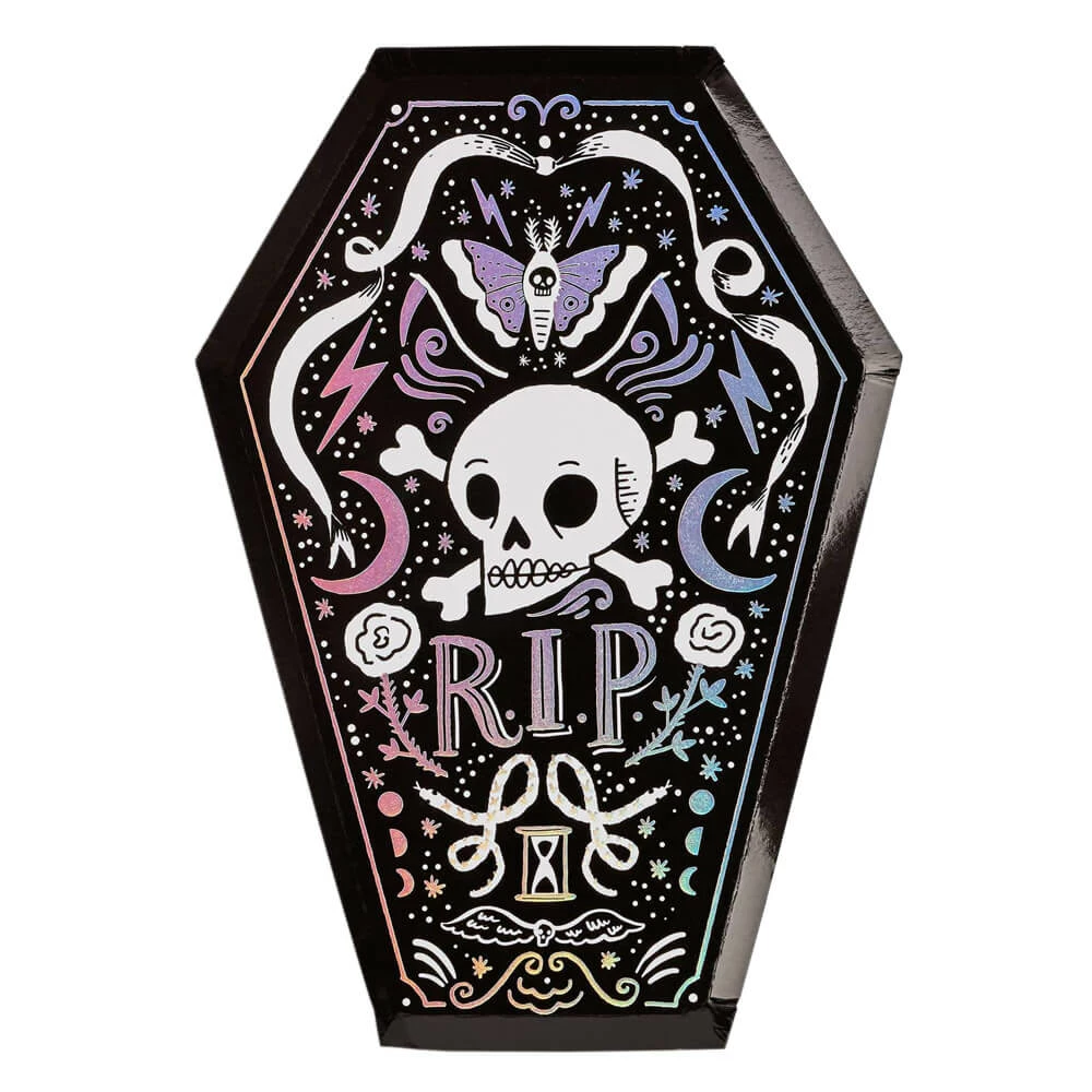 The coolest coffin in the graveyard! Featuring holographic silver foil-pressed elements, these Halloween coffin plates are to die for!