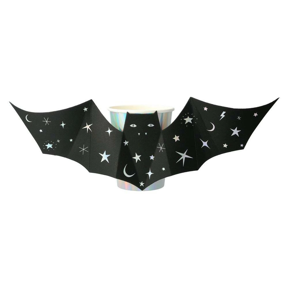 These shiny silver holographic cups, featuring black bats with outstretched wings, will thrill and chill your party guests! They are beautifully decorated with shimmering silver stars and moons, and will look amazing on the party table too.