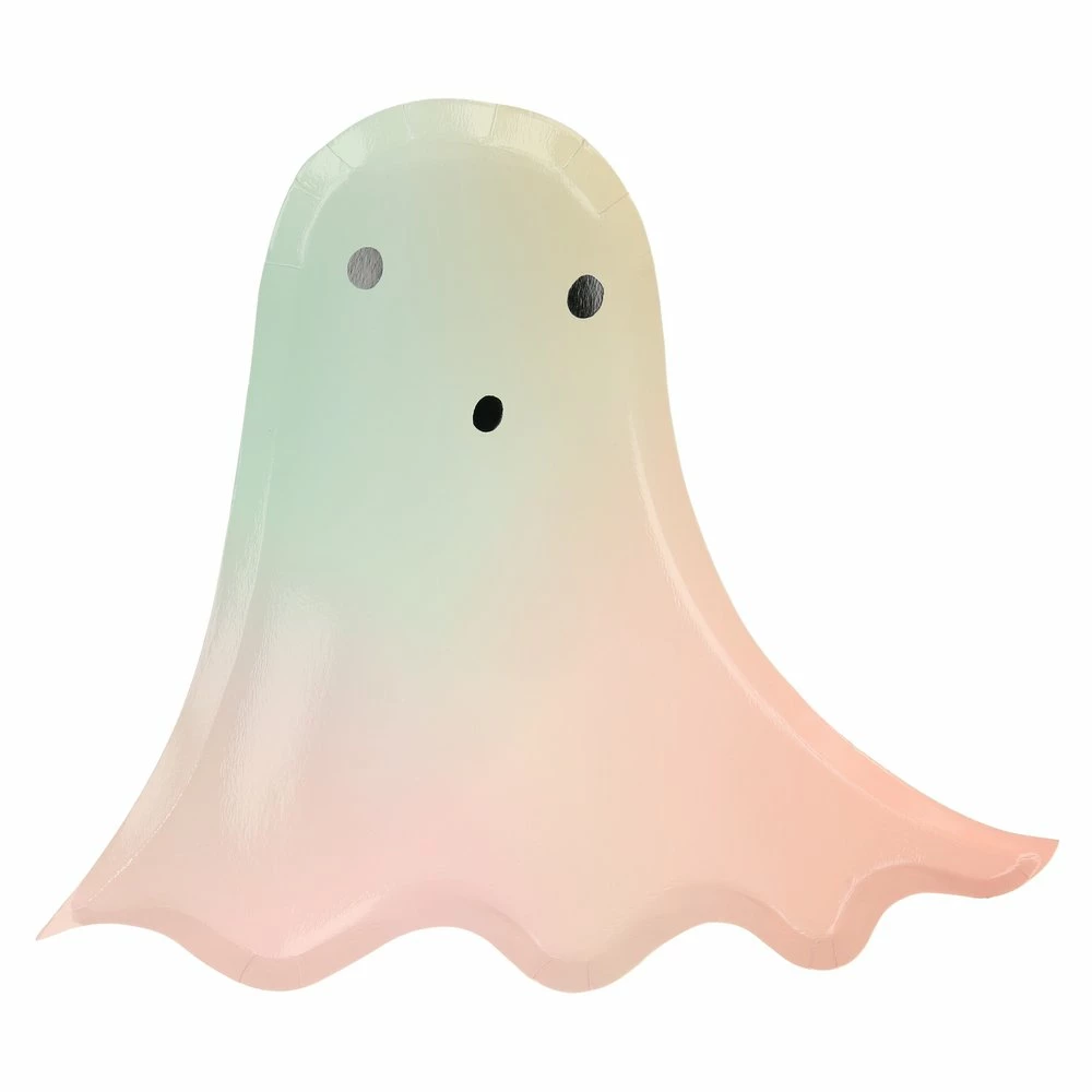 These fantastic ghost platesĀ areĀ sure to add a colorfully creepy touch to your Halloween party table. Crafted with an ombre design of pastel shades, they also make amazing party decorations. Ombre design contains mint, peach and pink colors while the eyes and mouth are silver foil.
