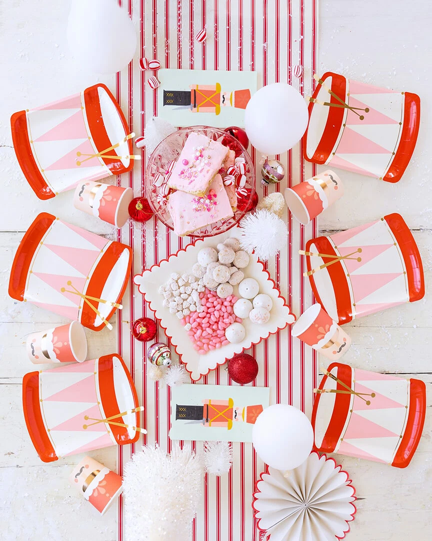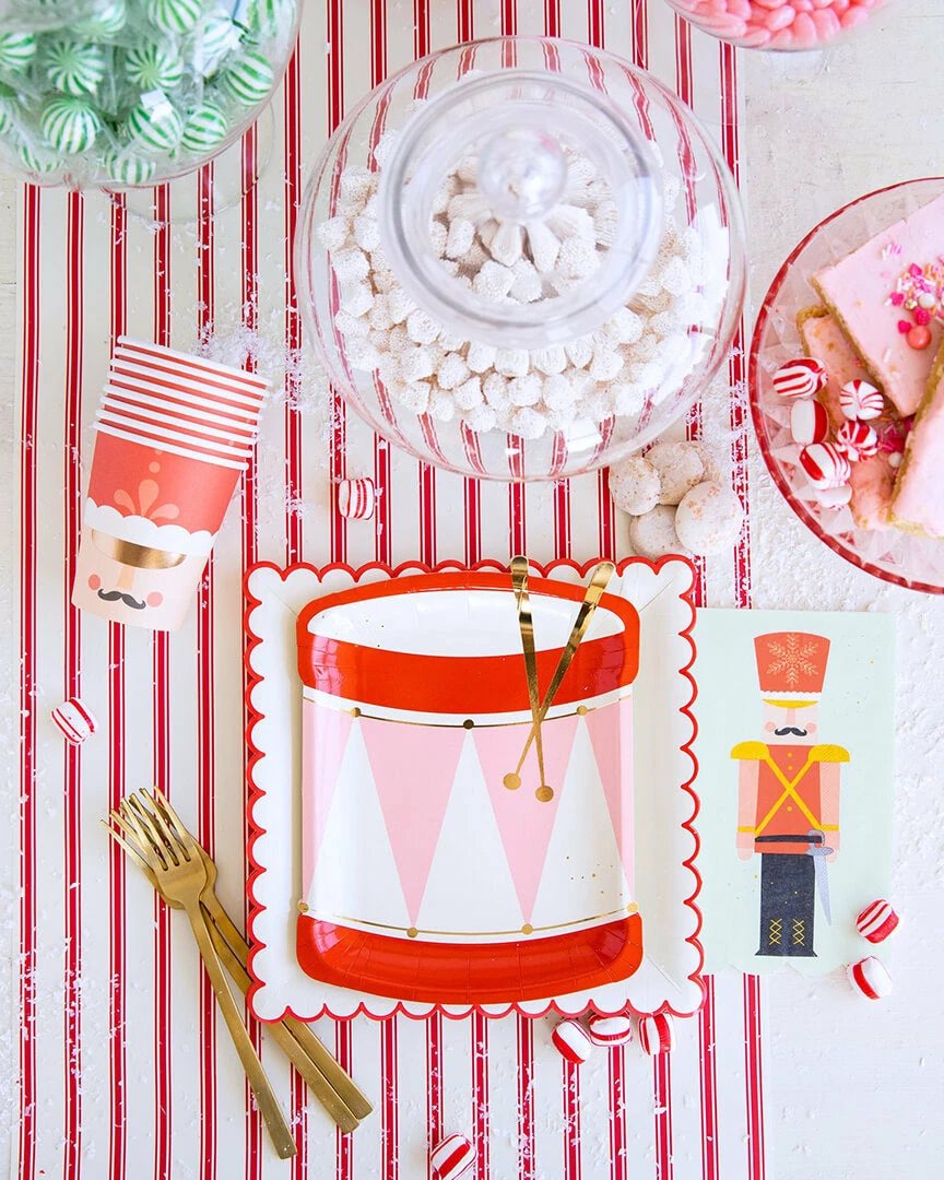 A whimsical Christmas mood will be at your table with these drum shaped plates. With gold foil accents, these plates are a magical finishing touch for your Nutcracker themed party. Pair these with our Nutcracker dinner napkins and cups to create a merry Holiday gathering that will have your guests in a festive mood!