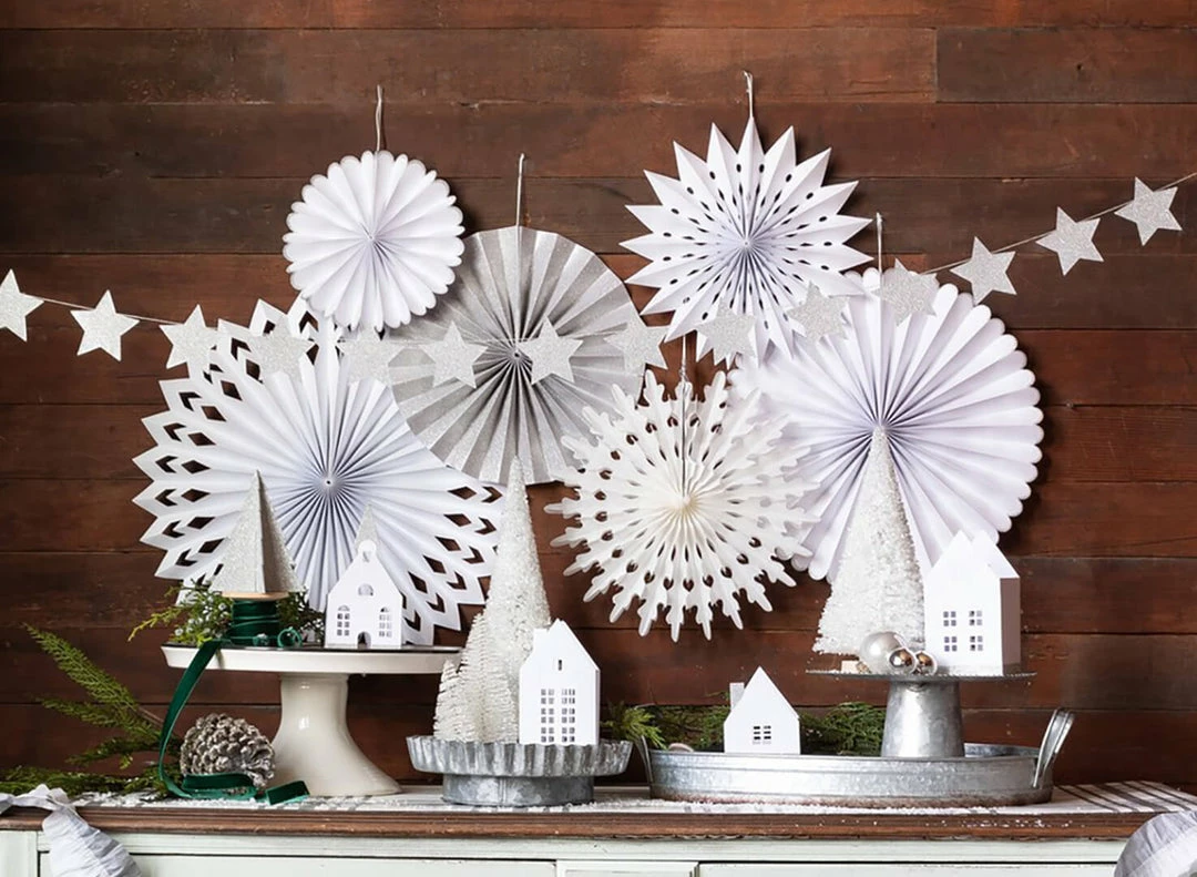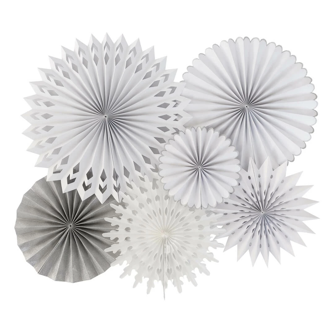 Create a winter wonderland while staying cozy inside with this collection of winter white party fans. Perfect to turn your holiday goodie table into a snowy winter scene. Style an elegant, modern mantle piece by hanging these snowflake inspired fans behind pretty white houses. These rosettes are a winter must have, their clean white design will create a cozy wintery atmosphere well after the holidays as you ring in the new year!
