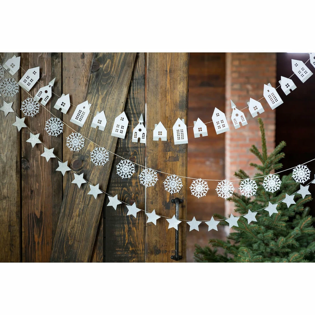 Modern farmhouse meets clean winter white with this cozy holiday house banner. Each house has sparkly silver glitter accents that makes this banner perfect finishing touch to your winter white decor. Inspired by traditional Christmas villages, this sleek and elegant banner is the perfect way to modernize a Christmas classic when you hang it on your mantle!