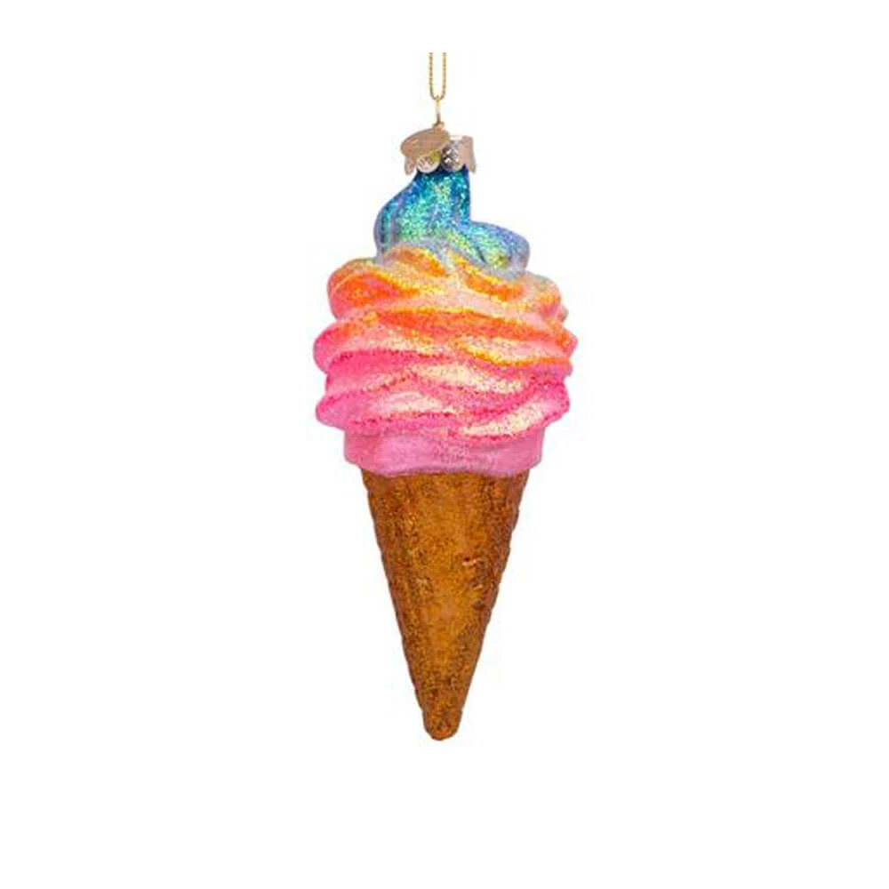 Rainbow Ice Cream Ornament by Vondels. Hand painted and mouth blown. Approximately 5.5″H.